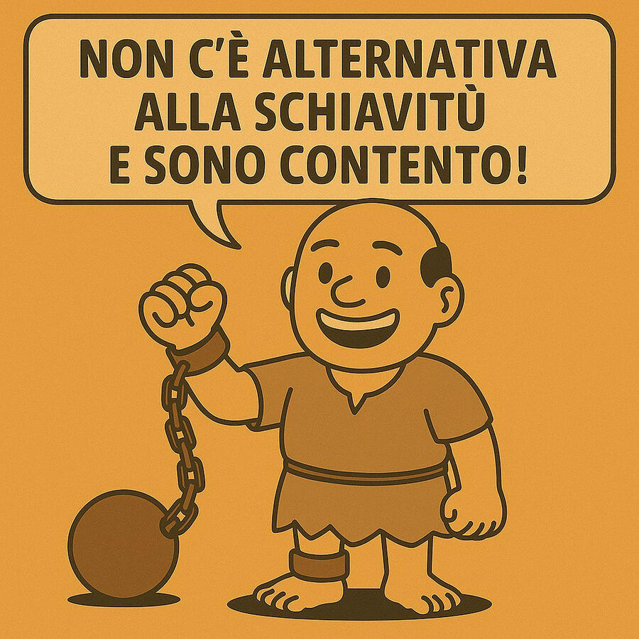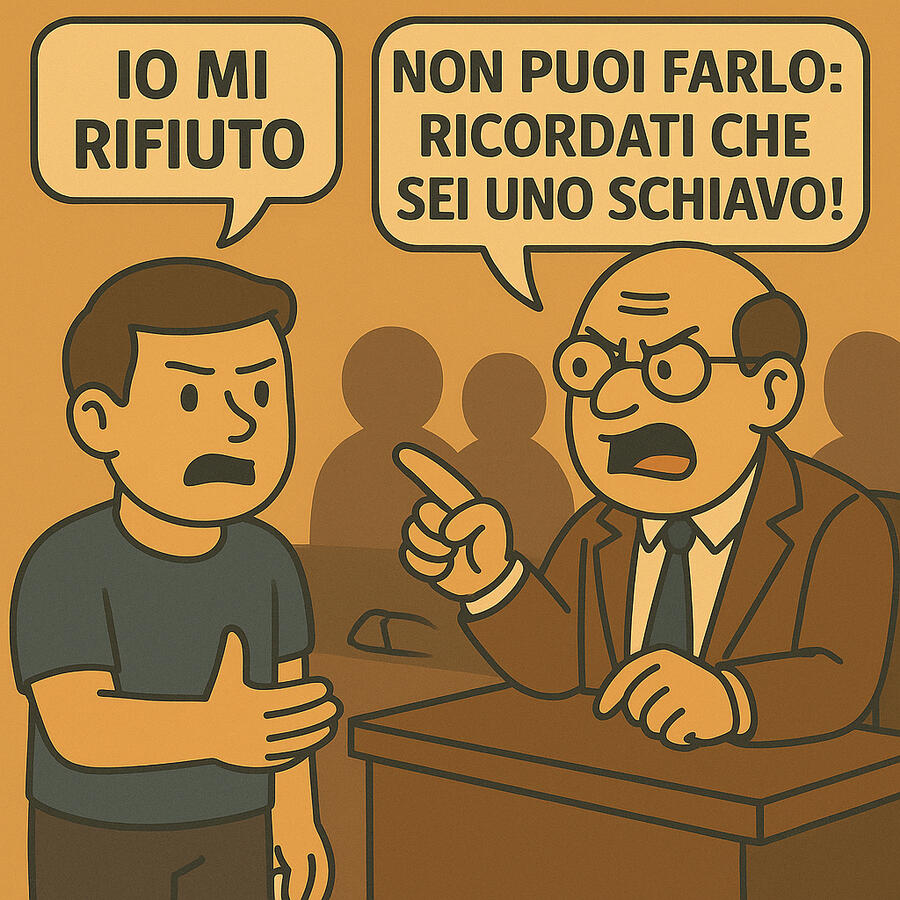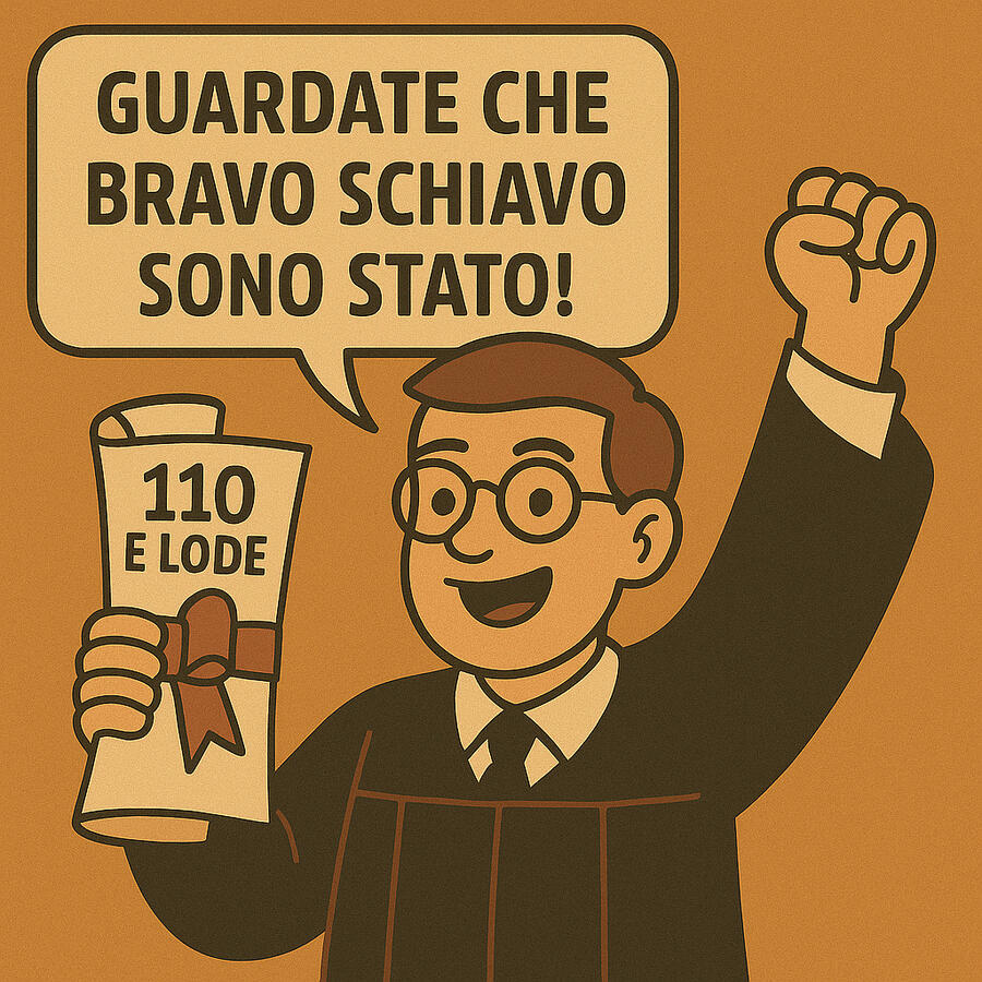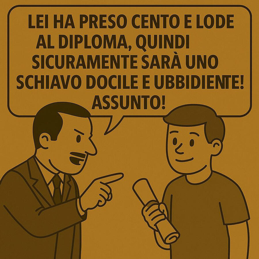 11/07/2025Io ho fatto il soldatino diligente, ho preso il massimo dei voti sia al diploma sia alla laurea!Potrei benissimo difendere i miei pezzi di carta, parlare dall'alto della mia laurea e dire: "Guardate che bravo schiavo sono stato!"Ma per me i miei pezzi di carta hanno davvero poco valore.Potrei inviarli a qualche azienda per dire: "Guardate come mi hanno reso docile e ubbidiente per farmi sfruttare!"Ero rimasto fregato per bene, ma almeno alla fine dell'università mi avevano promesso che avrei potuto inviare curriculum o fare concorsi per fare lo schiavo di qualche azienda o in un posto statale!Avevo smesso di credere alla laurea, ma mi ero detto: "Ormai questo percorso lo devo finire perché ho preso l'impegno. E i miei genitori hanno fatto sacrifici per pagarmi la gabbia, quindi mi laureo".Così, mi sono laureato con centodieci e lode. Ma per me è solo un pezzo di carta con un numeretto sopra.Anzi, quel centodieci e lode è il simbolo di quanto mi sono piegato e ho ubbidito come un perfetto schiavo. Quindi me ne vergogno.Mi pento di quel centodieci e lode. Avrei potuto dare di meno. Oppure avrei potuto evitare di sostenere il colloquio di laurea, come il ragazzo di Padova che ha evitato il colloquio di maturità.Ma avevo deciso di piegare il capo. Non per umiltà o rispetto delle istituzioni, ma perché sono stato un pirla. Ma anche un po' codardo.E comunque adesso comprate il mio libro di vignette, altrimenti devo andare a lavorare in una gabbia!O forse è giusto che anch'io faccia il bravo schiavo e mi spezzi la schiena per arricchire un padrone di azienda e permettergli di comprare una bella macchina?In fondo, se tutti fanno gli schiavi, perché io dovrei avere la presunzione di essere libero?