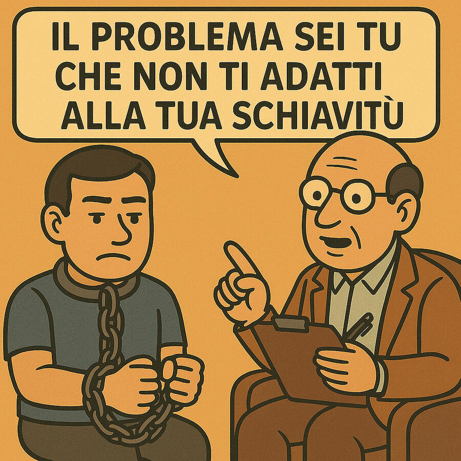 luglio 2025Se stai male, il problema sei tu!Se credi a questa frase, forse è perché ti hanno fatto il lavaggio del cervello e ti hanno fatto credere che se soffri perché vivi in una società malata è colpa tua. Ci sono molti profeti della "responsabilizzazione" che invitano ad assumersi la responsabilità della sofferenza causata da altri. Molti affermano che se vivi certe ingiustizie è per via del tuo karma passato o perché dentro di te hai delle vibrazioni che attraggono quelle situazioni! Oppure, la psicologia ti fa credere che sei tu che non ti adatti. Magari danno la colpa ai tuoi geni, o alla tua famiglia disfunzionale. Ma comunque il problema sei sempre tu, che non hai sviluppato la capacità di adattarti.Se soffri per un sistema ingiusto il problema sei tu! Non è colpa del sistema alienante, non è colpa dello sfruttamento, non è colpa delle cazzate che ti hanno messo in testa! No, è colpa tua che non sei in grado di adattarti abbastanza! Ci hanno fregato per bene, vero? E non ti invitano a una responsabilità sana, fatta di ribellione e libertà. No, ti invitano a essere un "adulto responsabile che piega il capo e ubbidisce". "Maturità" è diventato sinonimo di serena "accettazione della propria schiavitù". E se per funzionare hai bisogno di costose terapie e di farmaci lobotomizzanti, ben venga!Ma se quei farmaci e quelle terapie non facessero altro che sedare il tuo desiderio di ribellione, che ti parla attraverso sintomi e malesseri? Ma loro ti dicono che se senti un malessere devi metterlo a tacere, anche perché devi funzionare, devi essere produttivo, non puoi permetterti di fermarti! Non puoi ascoltarti! Non c'è tempo! E poi chi ti sostituisce in ufficio o in azienda?Tu te la bevi e ti adatti alla gabbia cercando di drogarti per stare bene... o ti ribelli per conquistare la tua libertà e la vera armonia?