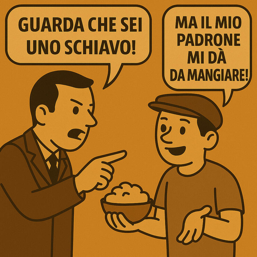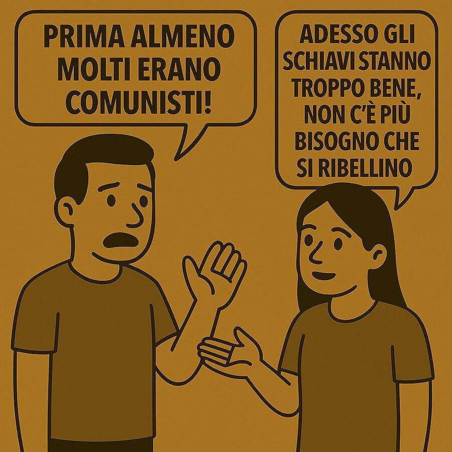 27/07/2025Premetto che non simpatizzo molto per il comunismo. Ma allo stesso tempo ritengo che Marx abbia detto alcune cose buone: secondo me ha azzeccato un po' il funzionamento dell'economia e del potere e si è reso conto di come la religione spesso sia "oppio dei popoli". Inoltre, ritengo che almeno i comunisti proponevano un'alternativa, per quanto poi, quando questa alternativa si è concretizzata, si è rivelata deleteria, forse quasi quanto il capitalismo!Ma, dicevo, almeno i comunisti proponevano qualcosa di diverso, facevano "massa critica". Oggi, invece, non esistono praticamente più ribelli. Il sistema ha zittito quasi ogni forma di ribellione, e non più con le armi, ma con il benessere. Il socialismo e i sindacati hanno dato dei contentini agli schiavi, così non si protesta più! Alcuni leader politici, come Giolitti, avevano capito che la cosa più funzionale al potere non era eliminare chi protestava, ma inglobarlo nel sistema. Se i contadini e gli operai protestavano per le loro condizioni penose, non bisognava rivoluzionare il sistema, ma bastava migliorare un po' le loro condizioni economiche!Oggi, diciamo che non possiamo più lamentarci. Ed è qui il problema. Qui in Occidente, per quanto ci sia sempre chi viva anche in condizioni molto cattive, tutto sommato "non possiamo lamentarci". Così, smettiamo di immaginare nuove possibilità. E ci accontentiamo della nostra schiavitù dorata, fatta di aria condizionata, connessione a Internet, vacanze estive... I latini avrebbero detto "panem et circenses"!
