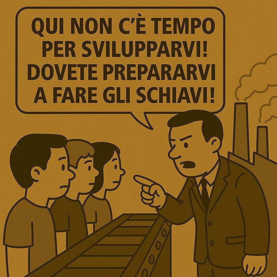 Crea individui impauriti, che tendono a compiacere gli altri.E poi ti insegnano che non puoi sbagliare. E come cazzo si cresce senza poter sbagliare, se ogni errore è punito?I ragazzi poi devono seguire una serie di regole che non vanno messe in discussione. Così imparano a essere pecore che si conformano. E se domani torna il fascismo, sono pronti a servirlo.I bambini entrano a scuola curiosi, ma escono senza voglia di conoscere più nulla, perché l'unica cosa che conta è studiare ciò che gli viene detto di studiare. Se uno poi vuole essere creativo, non può. Deve esprimersi dentro gli schemi. Si premia l'uniformità, non l'originalità. C'è un'unica risposta giusta, le altre sono censurate.La scuola prepara alla vita in fabbrica e in ufficio. Sveglia presto, campanella che stabilisce l'orario di ingresso, le pause e l'uscita. Non puoi pensare liberamente. Devi solo ripetere ed eseguire gli ordini, proprio come in azienda.E mica forma imprenditori o persone con idee loro! No, dipendenti abituati a ubbidire a datori di lavoro come schiavi fedeli e macchine performanti!La scuola poi ti fa derivare il tuo valore da dei numeri. Ti abitua a confrontarti con gli altri e a competere per prendere il voto più alto. Non promuove la collaborazione. Semmai, insegna ad andare gli uni contro gli altri e a invidiarsi a vicenda.Poi i bambini hanno bisogno di muoversi, di esprimersi, di giocare. E invece vengono rinchiusi per delle ore, in silenzio, ad ascoltare un insegnante che deve insegnare loro la "disciplina", ovvero a essere schiavi ubbidienti. La scuola è una prigione, ma nessuno lo vede. Anzi, consideriamo normale soffocare la vitalità dei bambini e dei ragazzi dietro i banchi di scuola, e li abituiamo a chiedere il permesso solo per andare in bagno.E poi, quante ore toglie la scuola ai ragazzi per addestrarli? Quanto tempo che potrebbe essere dedicato al vero sviluppo, al dialogo, all'esplorazione, alle relazioni, viene tolto dalla scuola? E nel frattempo si illudono i ragazzi che si stia provvedendo alla loro crescita! Sì, la crescita di bravi soldatini e futuri impiegati d'azienda!E quando la scuola finisce, sono pronti a passare alla gabbia del lavoro!