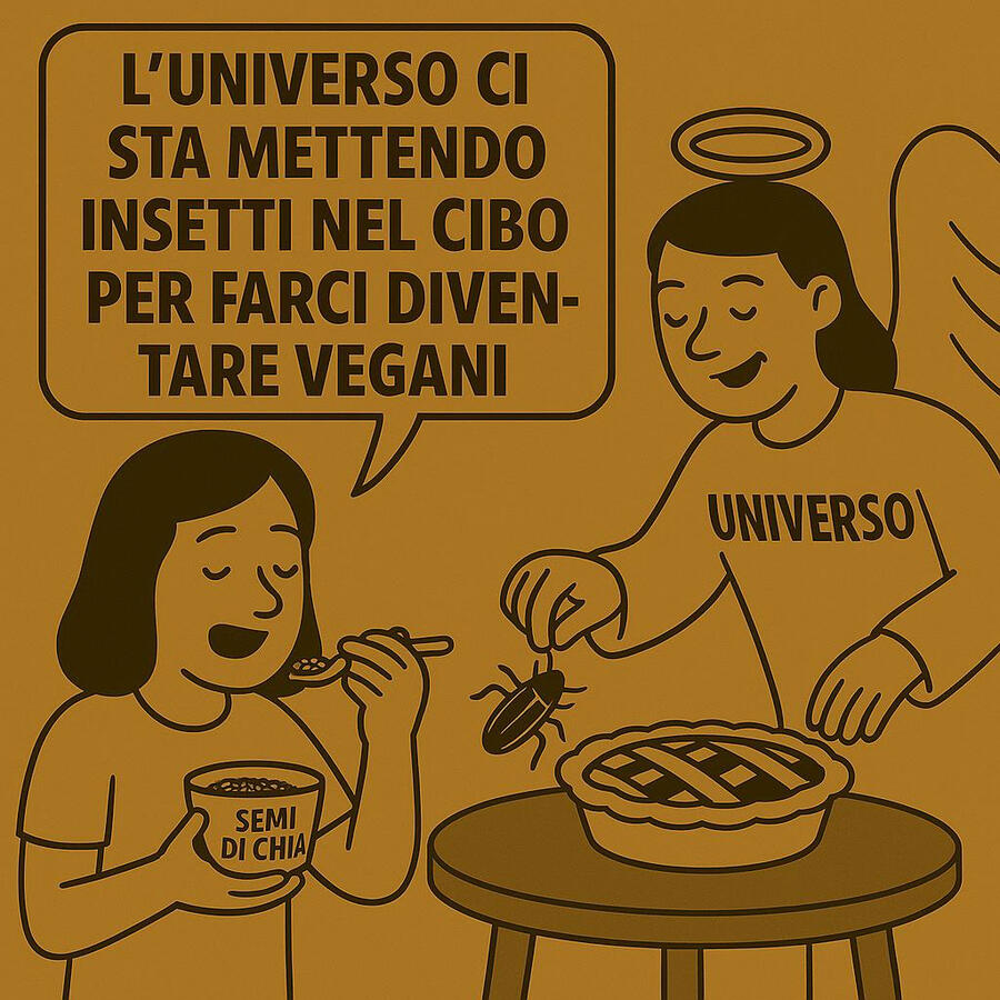 «Va da sé che, se prima digerivi certi alimenti, ora potresti rifiutarli, così come se prima li rifiutavi, ora potresti averne voglia». Questo cambiamento di energia a quanto pare è molto birichino e porta a cambiamenti imprevedibili nel rapporto con il cibo! Oppure, forse, semplicemente questi cambiamenti derivano da letture strane che portano ad avere paura di certi alimenti e a credere di doverne assumere altri per stare bene!«In questo contesto, è dunque fondamentale abbandonare un tipo di alimentazione tradizionale (basato prettamente su pasta, pane, pizza, focaccia, carne, pesce, insaccati, formaggi, latticini, salse, besciamella, panna, burro, strutto, dolci, biscotti, gelati, caramelle, cioccolata, bevande alcoliche, bevande gassate, vino, birra, caffè, te, ecc) che vede al centro del menù quotidiano piatti e desserts molto pesanti dal punto di vista dell'energia, della sostanza, delle calorie e della digestione». Capito? Dovete rinunciare a tutte le cose buone, altrimenti rischiate di ostacolare l'ascesa in quinta dimensione!«Il corpo ora sta perdendo densità e dunque ha bisogno di nutrirsi solo con cibi leggeri, prevalentemente costituiti da cereali integrali, legumi, uova, verdura, frutta fresca e secca, semi e tanta acqua. Niente più». Il corpo sta perdendo densità? Ma che vuol dire? E in che modo questo dovrebbe portare a mangiare cibi più leggeri? E tra l'altro, chi definisce quando un cibo è leggero? Ah, sempre la coach spirituale!«Questo per favorire sia l'espulsione delle tossine che si stanno smuovendo grazie alla vostra pulizia interiore sia per facilitare il processo in corso per il passaggio da struttura di carbonio a struttura di silicio ovvero cristallo». Qui il livello sale! Si parla di "espulsione di tossine" e di "passaggio da struttura di carbonio a struttura di silicio"! Ma che cosa siamo? Dei robot? 🤖 Comunque, mi chiedo se anche il cervello si evolverà durante l'ascesa in quinta dimensione!«Capisci bene che un corpo cristallino non può sostenere la carne, il pesce, le lasagne, i tortellini, la pizza, la maionese, il sant'honore', i biscotti, il vino, lo spumante e tutto il resto!». Quindi, ragazzi, quest'evoluzione potrebbe rendervi incapaci di digerire i vostri cibi preferiti!«Le tossine arrivano anche dall'alimentazione!». Questa affermazione, se fosse stata detta al di fuori di questo contesto, potrebbe anche avere senso. Ma qui si parla di "tossine" che impediscono la pulizia per ascendere in quinta dimensione!«In sostanza, a breve tutta la popolazione mondiale diventerà dapprima vegetariana poi vegana». Bella profezia! Ma le prove dove sono?«E dato che non è semplice convertire tutti ad una nuova alimentazione, l'Universo ci è venuto ancora una volta in aiuto con l'introduzione di strani insetti in tutti i cibi da eliminare dall'alimentazione tradizionale, che infatti presto verranno eliminati dal mercato mondiale». Avete capito? L'Universo (entità tanto benevola quanto immaginaria) sta inserendo insetti nel cibo che deve essere eliminato! Ma mi viene qualche domanda: innanzitutto, da dove nasce questa idea che stanno introducendo gli insetti per farci diventare vegani? Ah, giusto, è stata canalizzata da Sirio! A quanto pare, in realtà, stanno semplicemente introducendo gli insetti nella nostra alimentazione in modo trasparente, e non li stanno infilando a nostra insaputa nei cibi! E gli insetti sono sempre stati presenti nelle diete di molte popolazioni, senza che nessuno fosse schifato! Comunque, mi chiedo: che strategia sarebbe quella di introdurre insetti per farci diventare vegani? Vorrebbero farci schifare il cibo animale perché sostituiscono le bistecche di maiale con quelle di grillo? E comunque, io sapevo che anche nelle farine (comprese quelle integrali, che la coach sostiene facciano parte dell'alimentazione di quinta dimensione) già finiscono quasi inevitabilmente frammenti di insetti!«Per cui, invece di sparare a zero su chi ha introdotto questi insetti, comincia a cambiare alimentazione soprattutto se sei già in un percorso di risveglio spirituale». Capito? Bisogna essere grati di chi ha introdotto questi insetti, perché ci invita a cambiare alimentazione per il risveglio!«Impiegherai molto meno a ripulirti interiormente!». O forse impiegherete molto meno a ripulirvi interiormente se smetterete di leggere queste cazzate!«Se, invece, non ti stai ancora pulendo interiormente, prendi atto di questa futura trasformazione e avviati gradualmente verso il percorso per il risveglio spirituale». Capito? C'è sempre tempo!«Se vuoi essere guidato, scrivimi pure su Messenger». E qui la ciliegina sulla torta! Anche gli "esseri di luce" devono sopravvivere, e per questo fanno i coach spirituali! E se volete essere guidati verso un cambiamento totale (la distruzione di tutti i vostri neuroni rimanenti) contattate la coach spirituale e fatevi fregare dalle sue sparate... e magari fatevi fregare anche un po' di soldi!