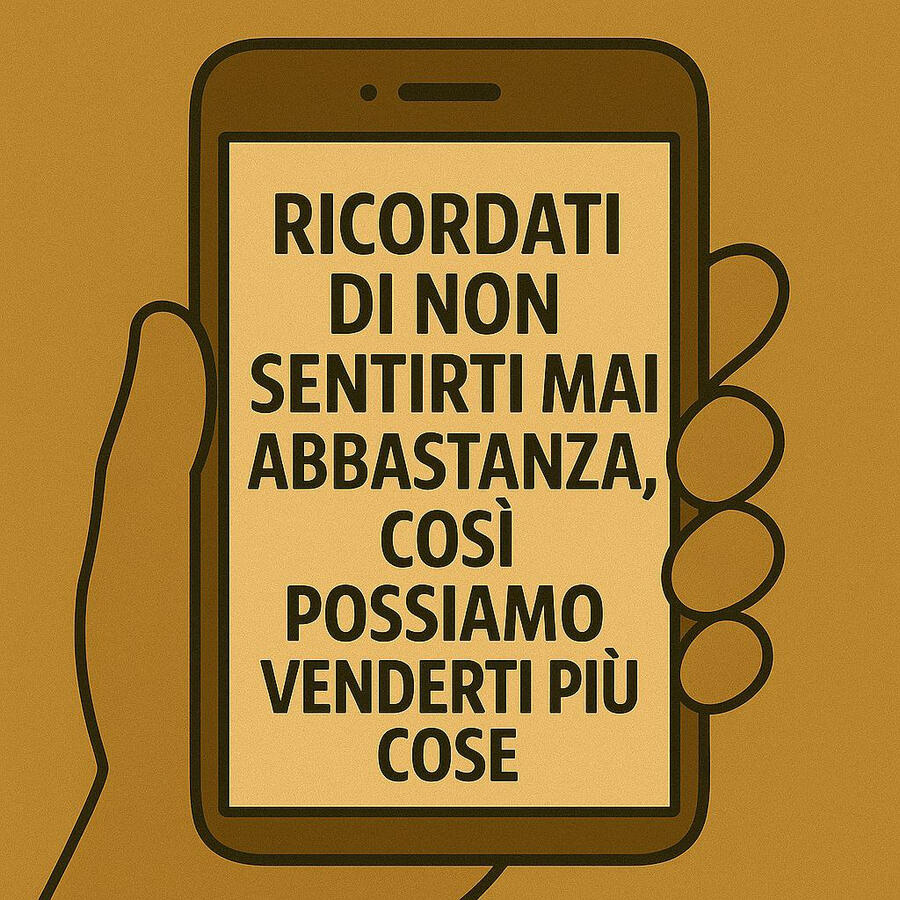 giugno 2025Uno degli inganni più subdoli della società di oggi è farci sentire costantemente insoddisfatti. Ci fa confrontare con modelli tossici, inarrivabili. Dal ragazzo che colleziona ragazze come fossero figurine, al fisico scolpito del bodybuilder dopato, al milionario di Dubai che vive di "rendite passive"...E noi ci facciamo fottere. Iniziamo a seguire anche noi quei modelli. Cerchiamo di diventare quel "sé ideale" che ci hanno propinato. Talmente ideale da esistere solo nella finzione, ma anche abbastanza reale da fotterci anni e anni della nostra vita, spesi a sacrificarci e a sentirci in colpa, frustrati, inadeguati.E spesso ci facciamo fottere anche il portafoglio.Infatti, i ladri di oggi non fanno più rapine a mano armata, non assaltano più le banche, non ti costringono con la forza ad aprire il portafoglio (a quello ci pensa già lo Stato). Al contrario, si tratta di gente rispettabile, in giacca e cravatta, che vende sogni. E molti di questi ladri sono stati fregati loro stessi da altri venditori di illusioni. E credono a quello che stanno facendo e alla fuffa che stanno vendendo.E cercano di convincerti che hai assolutamente bisogno dei loro prodotti o servizi, e tu ti aggrappi come se ti stessi salvando l'anima dalla dannazione eterna. E apri il portafoglio, pensando di poter eliminare così le tue insicurezze. Ma non fai altro che accrescere la tua sensazione di essere sbagliato, perché quella sensazione deriva dai modelli che hai accettato come un pirla, in cerca di un'identità non tua.E così, insegui il fisico dei tuoi sogni, che guarda a caso coincidono con i sogni di chi vuole venderti integratori o prodotti dimagranti, cerchi di diventare milionario, facendo diventare milionario chi ti vende corsi su come arricchirti in una settimana. Oppure ti fai truffare dal guru che ti vende il Nirvana come se fosse una pillola.Se vuoi del materiale per riflettere su tutto questo, potresti dare un'occhiata al mio libro di vignette bastarde. Ma se lo compri, aspettati di vedere distrutto tutto ciò in cui hai creduto finora.