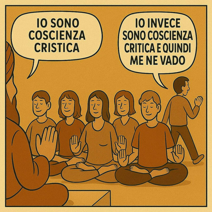 luglio 2025Molti affermano di essere coscienza cristica... ma io preferisco essere coscienza critica! Tanta spiritualità diffusa oggi è proprio il contrario del pensiero critico. Addirittura, spesso si consiglia di non pensare, perché la "mente mente". Certo, la mente può mentire, ma questo succede soprattutto quando uno non ha fatto pulizia dalle cazzate che gli hanno messo in testa (comprese quelle spirituali!). Se uno ha la mente piena di illusioni, mi pare ovvio che gli mentirà! Altrimenti, la mente può essere uno strumento molto potente! Può servire proprio ad attivare il senso critico.Molti spiritualisti non amano le domande e i dubbi, forse perché rischierebbero di mettere in discussione le illusioni a cui sono tanto affezionati! Affermano che i dubbi sono dell'ego, e quindi vanno lasciati andare! Inoltre, affermano che "non bisogna giudicare". In alcuni casi, ciò può avere senso quando si invita a non condannare gli altri (salvo che anche questo può diventare un dogma rigido e una regola morale soffocante). Ma spesso "non giudicare" equivale a scollegare il cervello e a smettere di avere opinioni critiche.La spiritualità di molti è solo un'accozzaglia di credenze rassicuranti. E queste credenze spesso diventano dogmi indiscutibili, verità assolute. E accanto a esse spesso vi sono delle regole morali asfissianti. In questo modo, molti si incatenano sempre di più, proprio mentre parlano di "libertà". E si addormentano sempre più profondamente in un sonno di illusioni, proprio mentre parlano di "risveglio". E vanno sempre più nell'oscurità, mentre parlano di "illuminazione".Le persone hanno un disperato bisogno di risposte facili, hanno bisogno di un senso, desiderano controllo e prevedibilità nelle loro vite e vogliono drogarsi per non sentire il dolore della loro esistenza. E molte forme di spiritualità offrono proprio questo. E quindi diventa facile caderne vittima. E così si perde il proprio senso critico e si spegne sempre di più il proprio cervello, mentre ci si mette nelle mani di un guru.Ed è incredibile il livello di stupidaggini a cui la gente finisce per credere. C'ero passato anch'io. E non me la stavo passando molto bene. Ma poi ho riscoperto la coscienza critica, che preferisco di gran lunga a quella cristica!