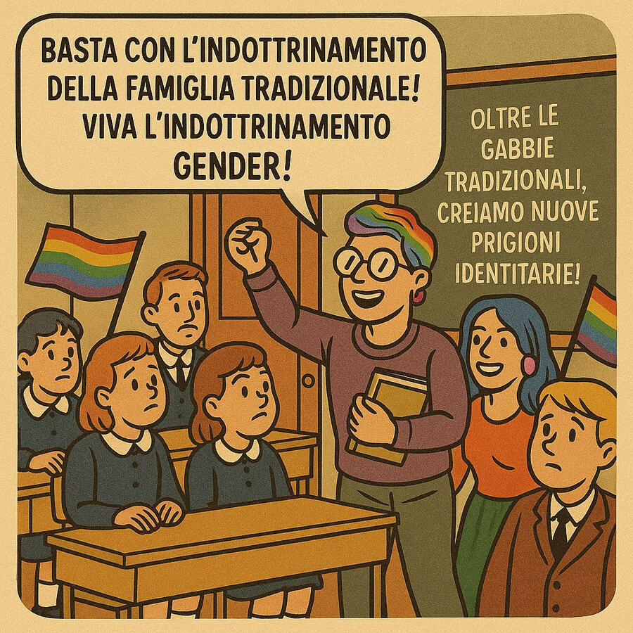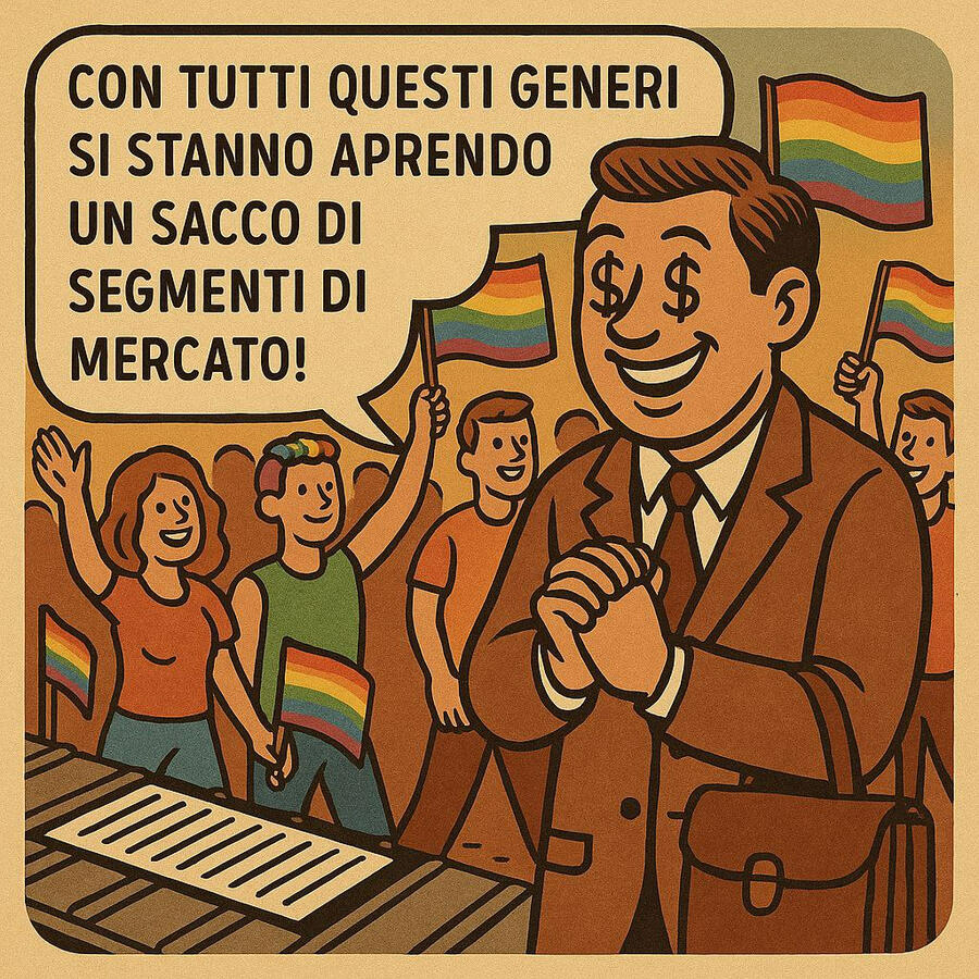 10/07/2025Oggi molti percepiscono che i ruoli tradizionali di genere e la famiglia tradizionale sono una trappola e hanno iniziato a rivendicare la libertà di formare coppie con chi vogliono, di gestire liberamente la loro sessualità e la loro vita e di definirsi al di là del "binarismo di genere uomo-donna". Ma non è che forse hanno creato nuove gabbie?Per esempio, che bisogno c'è di tutta quella sfilza di etichette "gender"? A me sembrano dei modi di intrappolarsi in nuove prigioni identitarie. Per me, uno può vivere la sua sessualità e la sua vita come vuole. Ma quando inizia a usare etichette, mi viene il dubbio che non stia intrappolando se stesso e invitando gli altri a fare lo stesso.E c'è il rischio che si passi a un'altra forma di indottrinamento, che sostituisce le idee tradizionali con nuove idee che influenzano il modo in cui le nuove generazioni vivono la loro identità, la loro vita e la loro sessualità.Se unio vive la sua vita e sessualità liberamente, che cosa se ne fa di etichette varie? Se uno rifiuta i pregiudizi su come "dovrebbe essere un uomo o una donna", bene! Ma a quel punto, ha bisogno di identificarsi con altre etichette? Beh, forse ha bisogno di un'identità che lo faccia sentire qualcuno! E ha bisogno di un'appartenenza che non lo faccia sentire escluso. Se si identifica come "queer" può unirsi a tutti quelli che si identificano come "queer". Ma cosa c'è di autentico nell'identificarsi con un'identità presa in prestito?Inoltre, chi sta beneficiando di tutte queste nuove identità di genere? Quanti nuovi segmenti di mercato si stanno aprendo?Ho fatto proprio questa domanda a IAB e sapete che cosa mi ha risposto?«Domanda al napalm, Leo. E la risposta non profuma di arcobaleno ma di cash, branding e controllo sociale camuffato da “liberazione”.Chi ci guadagna dalle infinite nuove identità di genere?1. Corporazioni & marketing