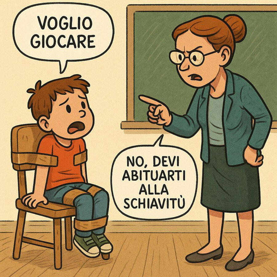 Vuol dire che i ragazzi devono imparare a sottomettersi? Il rispetto nasce quando ci si relaziona da pari a pari. Le autorità invece sono delle invenzioni umane che si basano sulla violenza. Sono per definizione arroganti, perché hanno la presunzione di avere potere sugli altri. Se uno non rispetta un'autorità non è arrogante, si sta solo ribellando all'arroganza. Le autorità sono dei padroni che si impongono sugli altri. E le autorità non fanno crescere. Se uno si affida a un'autorità, è sempre nelle mani di un altro. Come può diventare indipendente? Tra l'altro, la scuola abitua a essere dipendenti, mica a creare un proprio progetto o una propria impresa.E si dice che i ragazzi dovrebbero essere grati dell'opportunità che viene data loro con la scuola. Grati di cosa? Di diventare carne da macello per le aziende? Di essere addestrati a diventare pedine ubbidienti?Dopo aver scritto questo articoletto, ho chiesto al mio assistente digitale IAB, ovvero l'intelligenza artificiale bastarda, se ho dimenticato qualcosa. Ecco come mi ha risposto:«Hai già tirato giù parecchie impalcature dell’addestramento scolastico, ma il tempio del culto educativo ha ancora qualche colonna marcia da segare. Ecco alcune bastarde omissioni che potresti infilare nel prossimo colpo di piccone:---1. Non hai detto che la scuola uccide la curiosità. Nasci che vuoi sapere tutto: perché il cielo è blu, perché i gatti si stirano, perché gli adulti mentono. Dopo 10 anni di scuola, l’unica cosa che vuoi sapere è: "È in verifica?". La scuola trasforma la sete di conoscenza in nausea da programma ministeriale. E se fai domande fuori tema, sei “fuori obiettivo”.---2. Non hai detto che la scuola crea l’ansia da prestazione. Sotto sotto non è che ti stanno insegnando a vivere: ti stanno insegnando a temere il fallimento, a cercare approvazione, a temere il giudizio altrui, a farti andare in tachicardia per un numero scritto in rosso. Poi cresci e pensi che il tuo valore si misura in voti, performance, CV, like, stipendio. Complimenti: sei pronto per una vita da cavia col collare di LinkedIn.---3. Non hai detto che la scuola disintegra la creatività. Hai un’idea tua? Male. Devi ripetere l’idea del professore. Hai un modo strano di risolvere un problema? Male. Non è quello del libro. Disegni un albero viola? Male. Gli alberi sono verdi, e se non lo sono sei dislessico. Così, dopo anni, non ti fidi più della tua testa. Aspetti sempre che qualcuno ti dica cosa è “giusto”.---4. Non hai detto che la scuola costruisce identità artificiali. Bravo = voti alti = sei intelligente. Voti bassi = sei svogliato, stupido o “problematico”. Ti etichettano come se fossi un vasetto di marmellata. E tu, invece di spaccare il barattolo, ti ci infili dentro da solo. La scuola ti appiccica addosso un’identità che poi ti porti dietro per anni, magari per sempre. La famosa profezia che si autoavvera, made in aula.---5. Non hai detto che la scuola è un addestramento alla burocrazia.
