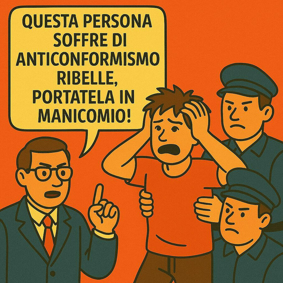 luglio 2025Condivido con voi il mio DSM-B, una parodia bastarda del DSM-5. Per chi non lo sapesse, il DSM-5 è il Manuale diagnostico e statistico dei disturbi mentali, la sacra Bibbia di psicologi e psichiatri. Non anticipo nulla: ve lo metto subito qui sotto.------------------------------------------------------------------------------------DSM-BDISTURBI:Tutti i disturbi di questo manuale vanno curati con terapie psicologiche normalizzanti, pillole anti-ribellione e droghe spirituali anestetizzanti.Disturbi d'ansia:malesseri che lo schiavo prova quando si sente insicuro e oppresso da una società che lo schiaccia. Tra le terapie normalizzanti, possono essere molto utili meditazioni lobotomizzanti per lasciar andare lo stress, farmaci e terapie per farlo sentire uno schiavo sicuro di sé e capace di servire qualunque padrone senza problemi.Disturbo d'ansia sociale:disturbo dello schiavo che ha paura di essere giudicato per non essere abbastanza adatto alle varie gabbie sociali. Va curato con terapie d'esposizione graduale alle varie gabbie sociali che lo fanno sentire a disagio e va spinto a recitare la sua parte di schiavo finché non si adatta.Depressione:disturbo dello schiavo che non riesce a essere felice nella sua gabbia. Tra i sintomi, lo schiavo depresso può sentirsi alienato dalla società perché ancora non è riuscito a integrarsi nella sua gabbia; può desiderare di porre fine alla sua vita in gabbia; sente che la sua schiavitù non ha senso. Va drogato con farmaci, terapie e meditazioni che lo facciano sentire felice anche se si sente sfruttato, sereno anche se stressato, in pace anche se ha la guerra dentro.ADHD:disturbo dello schiavo che non riesce a rimanere fermo in gabbia e vorrebbe ribellarsi e sfogare le sue energie. Va curato con farmaci che lo facciano stare incollato alla sedia del banco di scuola o della scrivania dell'ufficio.Disturbo paranoide di personalità:disturbo dello schiavo tormentato dal dubbio che il sistema non voglia il suo massimo bene o che voglia addirittura mantenerlo in gabbia e renderlo una marionetta. La terapia d'eccellenza è una ristrutturazione cognitiva che gli insegni a lasciar andare questi pensieri e a sostituirli con pensieri più consoni come: "Se mi sento in gabbia questa è solo una mia interpretazione. In realtà sono libero e vivo nel migliore dei mondi possibili".Disturbo narcisistico di personalità:disturbo dello schiavo che ha la presunzione di ribellarsi alle autorità narcisistiche che lo opprimono, come quella dell'insegnante, dello psicologo, del medico, del governo. Va trattato con terapia cognitivo-comportamentale per insegnargli a sottomettersi alle autorità senza sentirsi schiacciato.Perfezionismo patologico:disturbo dello schiavo che ha aspettative molto alte su di sé ma non riesce a soddisfarle. Molto utile è la terapia cognitivo-comportamentale per ristrutturare le sue convinzioni e aiutarlo a capire che non deve necessariamente essere uno schiavo perfetto e può anche essere uno schiavo imperfetto: l'importante è che sia funzionale al sistema.Disturbo ossessivo-compulsivo di personalità:disturbo dello schiavo che cerca di essere ineccepibile per conquistare l'amore dei suoi padroni. Va curato con ristrutturazione cognitiva per insegnargli che può essere più flessibile, purché sia sempre ubbidiente e sottomesso.Disturbo ossessivo-scientifico:disturbo dello schiavo che segue il culto della scienza invece che ascoltare il proprio corpo e sperimenta sensi di colpa quando non riesce a seguire completamente le linee guida. Va curato insegnandogli a essere più flessibile e ad ascoltare di tanto in tanto il suo corpo, purché non metta in discussione la scienza e segua comunque le linee guida.Disturbo ossessivo da crescita personale:disturbo dello schiavo che vuole diventare uno schiavo sempre migliore: si sente in colpa se non è abbastanza produttivo; se il corpo gli chiede di riposare, lui pensa che sia soltanto pigrizia. Va curato insegnandogli che uno schiavo ha anche bisogno di ricaricare le batterie e a perdonarsi per essere pigro. L'importante è che poi torni a essere efficiente!Disturbo ossessivo-spirituale:disturbo dello schiavo che ha una forte tendenza a drogarsi di spiritualità per sopportare meglio la sua schiavitù. Si sente in colpa ogni volta che prova un'emozione naturale come la rabbia verso il sistema che lo opprime. Per lui ogni impulso di ribellione è un segnale dell'ego, che va eliminato. Ogni volta che gli viene un pensiero, specialmente critico verso il sistema, o un dubbio, lo lascia andare, fino a diventare un'ameba lobotomizzata. Va curato con terapie basate sul perdono e l'accettazione di sé, per perdonarsi quando prova rabbia o desiderio di ribellarsi: è naturale avere un ego, basta tenerlo nei ranghi!Disturbo evitante di personalità:disturbo dello schiavo che evita il teatrino sociale perché non si sente all'altezza dei ruoli che dovrebbe recitare. Va curato con terapie d'esposizione graduale al teatrino sociale, per abituarsi a indossare delle maschere senza sentirsi troppo a disagio.Disturbo dipendente di personalità:disturbo dello schiavo che non può fare a meno dei suoi padroni. Va curato insegnandogli a interiorizzare la voce dei suoi padroni senza bisogno di loro, in modo da diventare uno schiavo autonomo.Disturbo oppositivo-provocatorio:disturbo dello schiavo che si ribella ma viene costretto a rientrare nei ranghi. Ha dei problemi con le autorità e manifesta atteggiamenti di sfida, che vanno risolti insegnandogli a capire il valore di essere più ubbidiente.Disturbo della condotta:disturbo dello schiavo che osa mettere in discussione le regole sacre della società e comportarsi in modo libero.Disturbo del ribelle bastardo:disturbo dell'ex-schiavo che è uscito da tutte le gabbie ed è un elemento di disturbo per la società.TERAPIE:Mindfulness: protocollo che permette di sentirsi calmi anche mentre si viene oppressi, grazie a pratiche meditative provenienti dall'