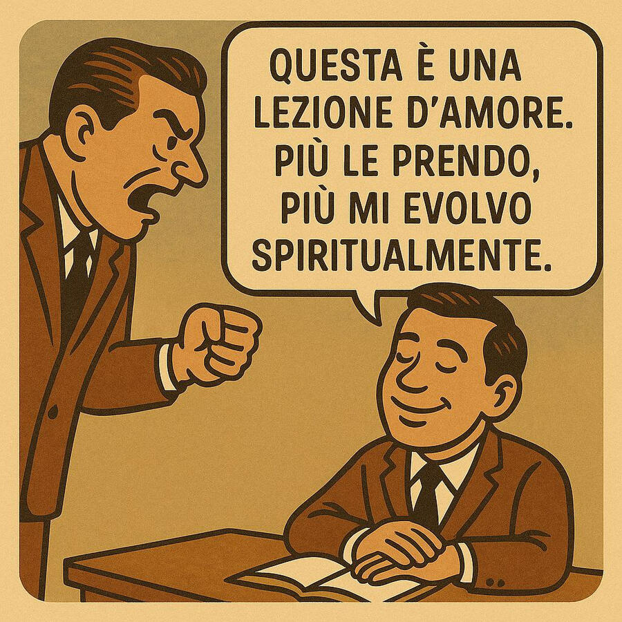 27/07/2025Io a scuola avevo dieci in condotta. Sapete perché? Perché ero un bravo burattino, che si sottometteva alle regole, compiaceva gli insegnanti, non arrecava nessun disturbo. Avevo interiorizzato la voce dei miei padroni fin da piccolo! E credevo che essere un "bravo ragazzo" significasse essere docile, ubbidiente, remissivo. Ero proprio uno "studente modello", ovvero un perfetto burattino! Così, mi sono meritato un bel dieci in condotta!