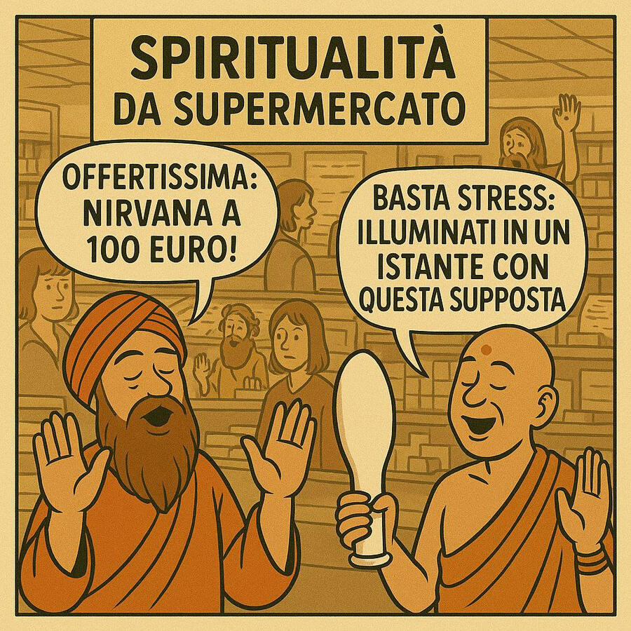 27/07/2025La spiritualità comune è una forma di marketing: risponde a dei bisogni (di senso, di fuga dal dolore, di bisogno di certezze, di bisogno di pace...), li manipola (facendo credere che nascano da una "spinta spirituale") e offre la soluzione, spesso a caro prezzo... Sono tanti i guru e i "coach spirituali" che vendono percorsi di risveglio! Certo, anche loro, poverini, devono sopravvivere! Alcuni di questi creano delle vere e proprie sette e chiedono doni, ma soprattutto pretendono la sottomissione incondizionata dei loro seguaci, che devono adorarli come divinità. Alcuni, addirittura, affermano di essere l'incarnazione stessa di Dio!Ma anche quando la spiritualità è "gratis", spesso vende comunque delle soluzioni esattamente come fa il marketing. E in molti casi il prezzo da pagare non è monetario, ma è la propria libertà, la propria indipendenza, il proprio senso critico, che vengono venduti in cambio di una pace illusoria. Il guru diventa il venditore di illusioni a cui ci si affida anima e corpo per ottenere quella pace. E ancora prima di farsi fottere il portafoglio, ci si è fatti fottere la propria intera esistenza. Non si è più in grado di camminare senza affidarsi a qualcuno che dia delle risposte e risolva i nostri problemi con la sua "saggezza". Non si riesce a fare a meno di seguire le promesse del guru, e si passano anni e anni della propria vita alla ricerca di un Paradiso immaginario. E così la propria angoscia aumenta, si è sempre in tensione, alla ricerca di qualcosa di impossibile. Nel frattempo, i propri problemi reali non vengono affrontati... e si diventa sempre più schiavi, dipendenti, impotenti...